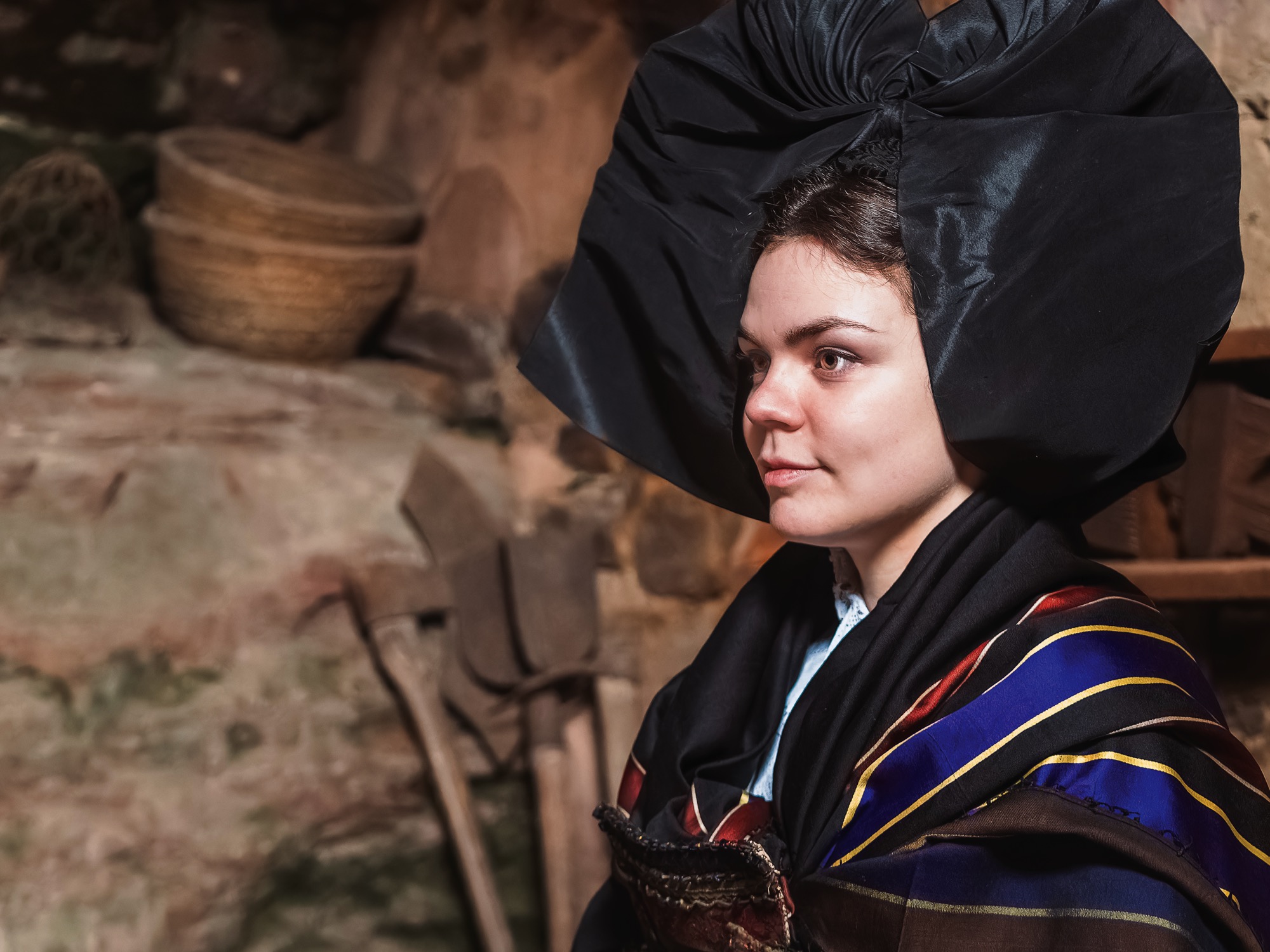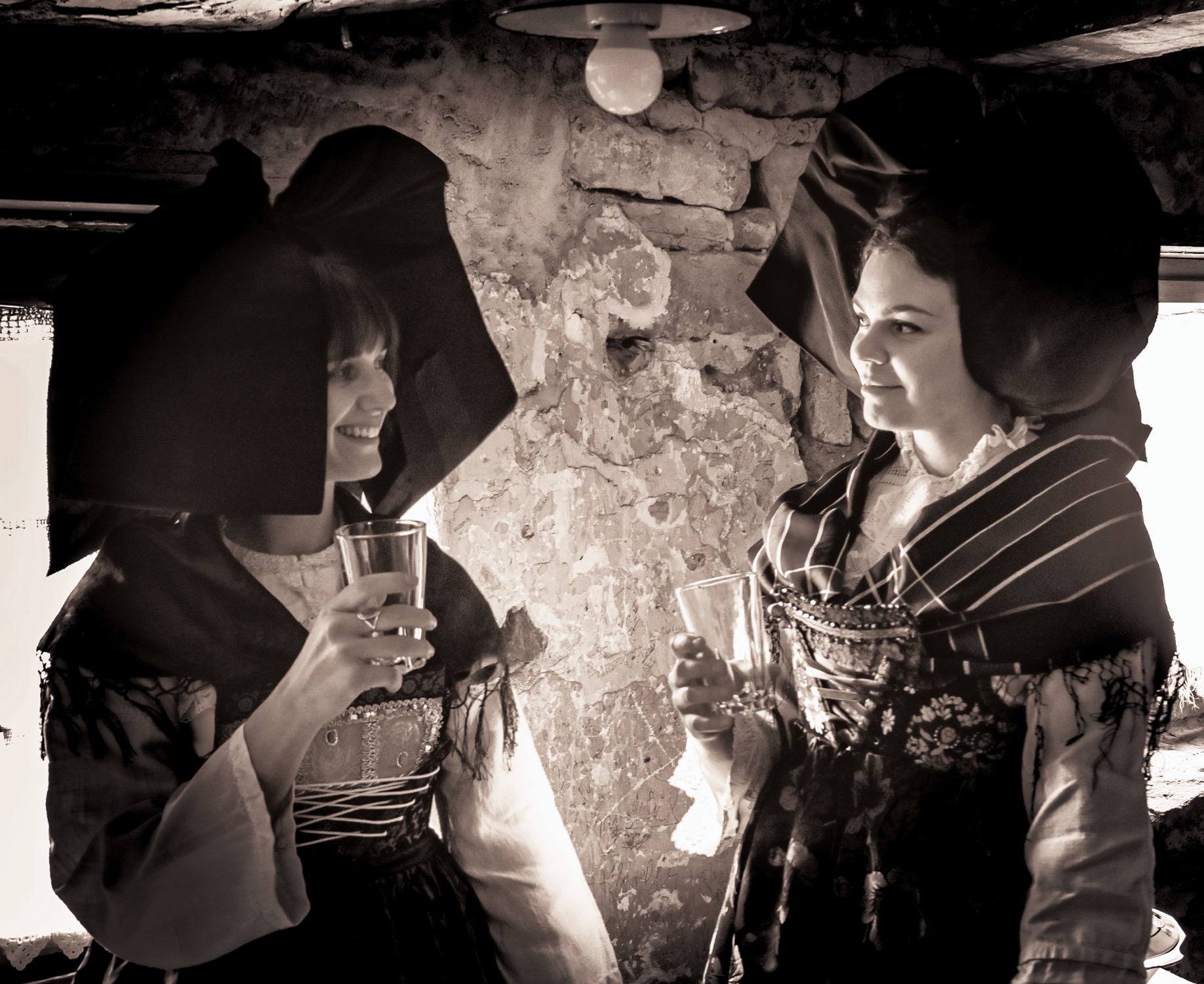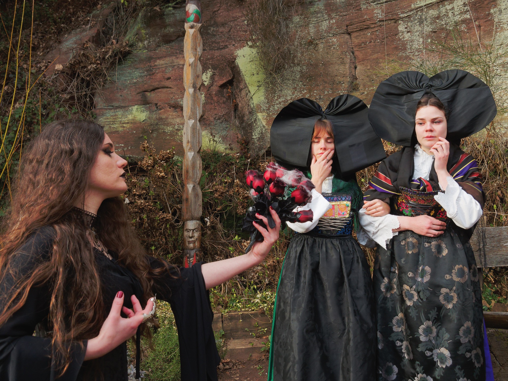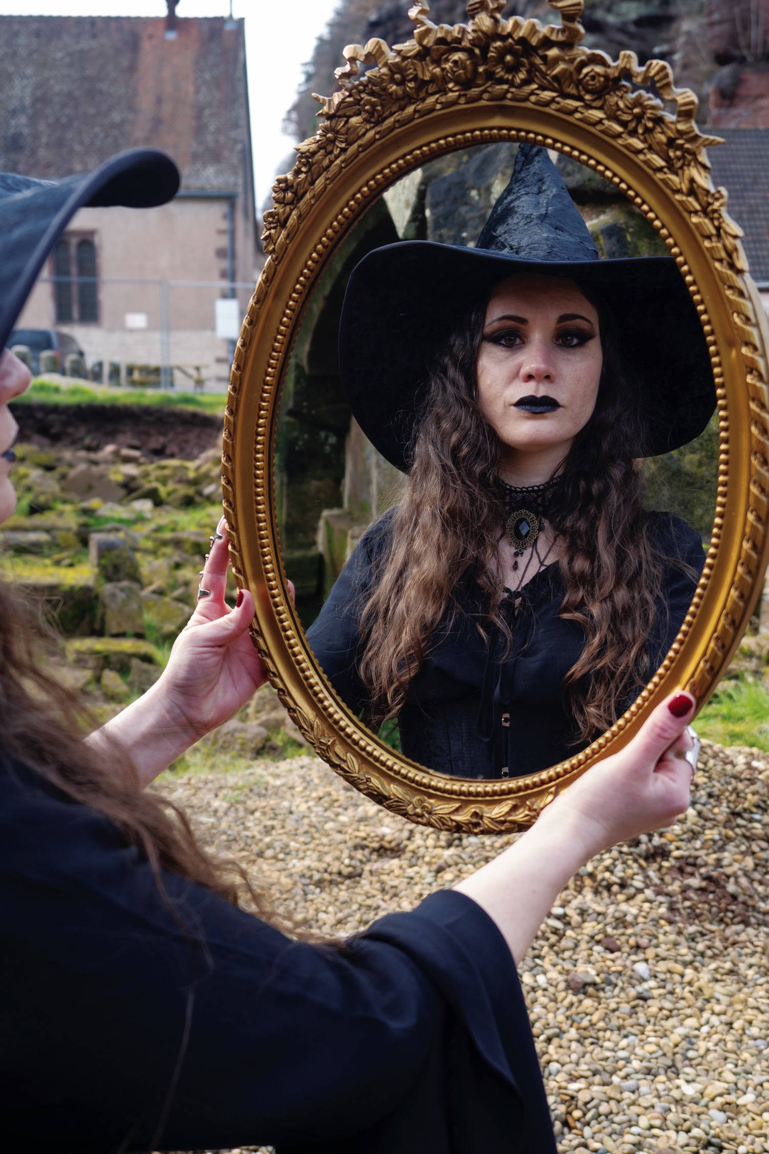 Que nous racontent ces photos de l’histoire des lieux ? Les rochers, les murs, les forêts semblent être les gardiens de secrets enfouis, portant en eux la trace de ceux qui ont habité ces lieux austères. Les ombres du passé, les silences d’antan, résonnent ici à travers chaque image. Deux Alsaciennes se dessinent en ombre et lumière, comme des invitées énigmatiques, presque intemporelles. On croit entendre les murmures de la sorcière, étrange et fascinante figure qui traverse l’exposition. Elle est l’autre, celle qui unit le visible et l’invisible, celle qui nous invite à aller au-delà des apparences.