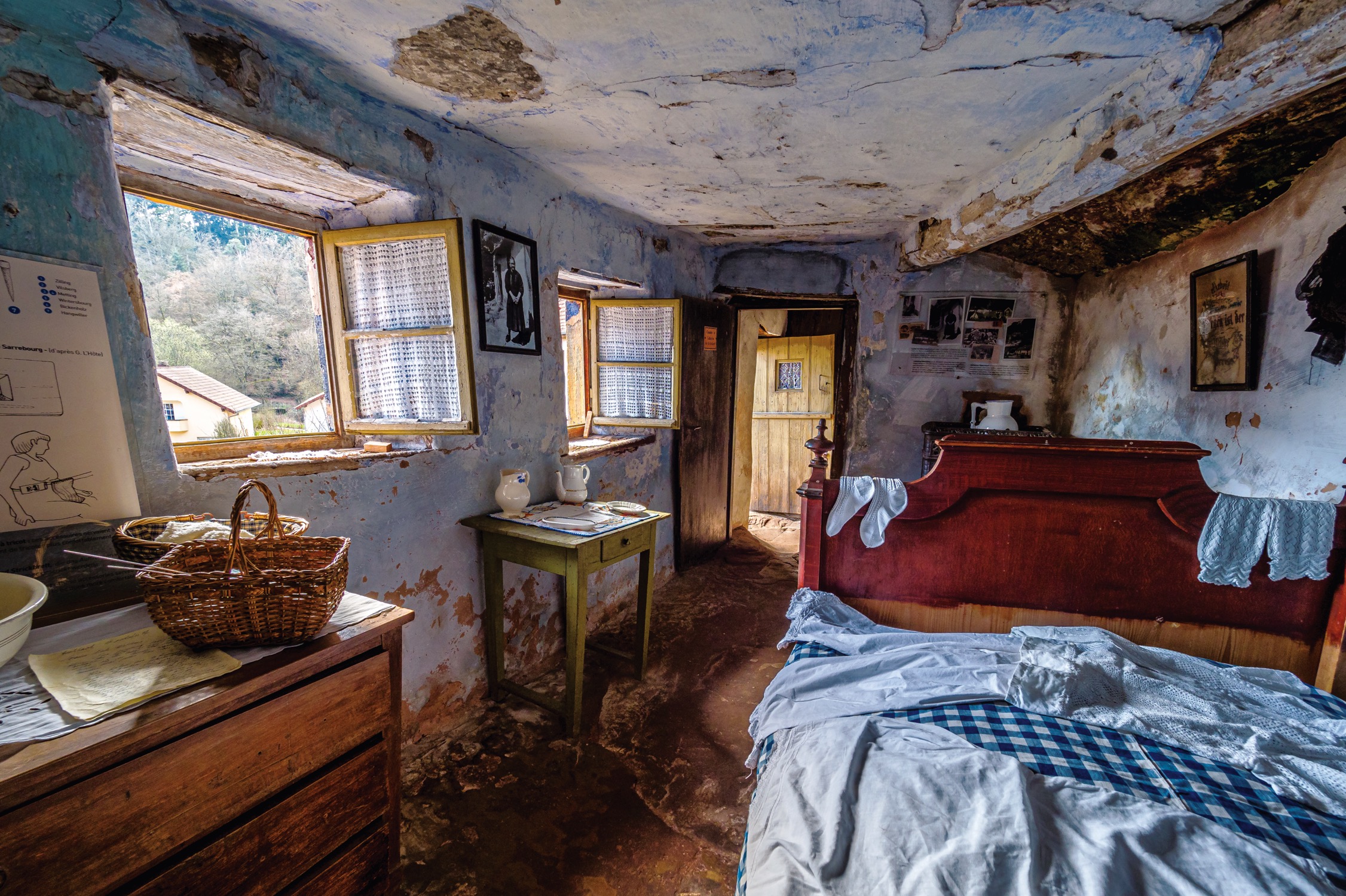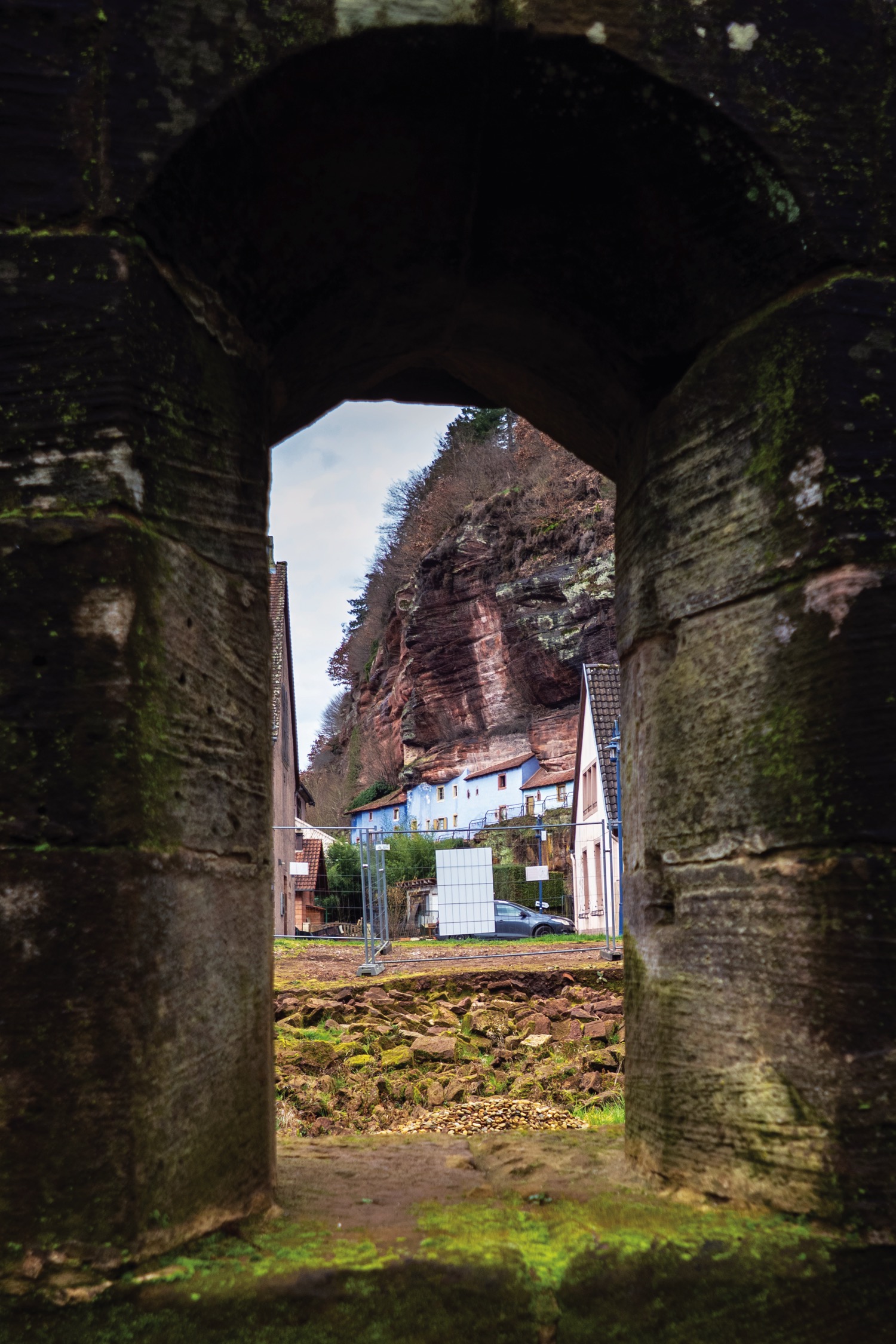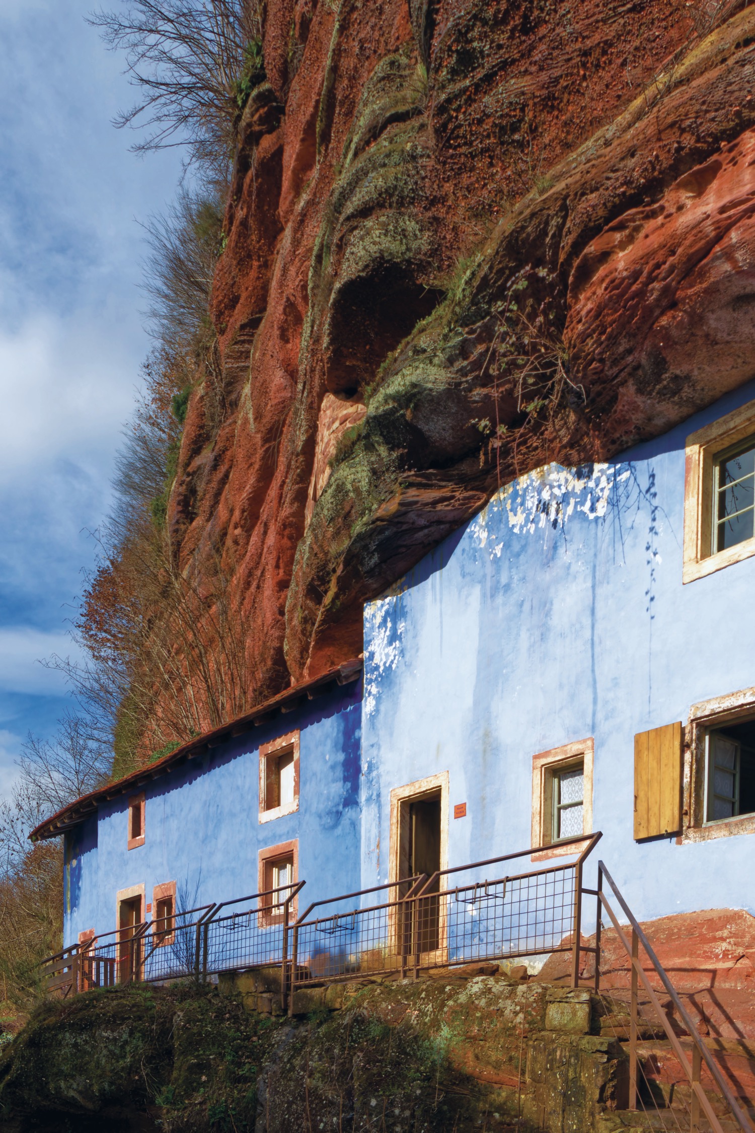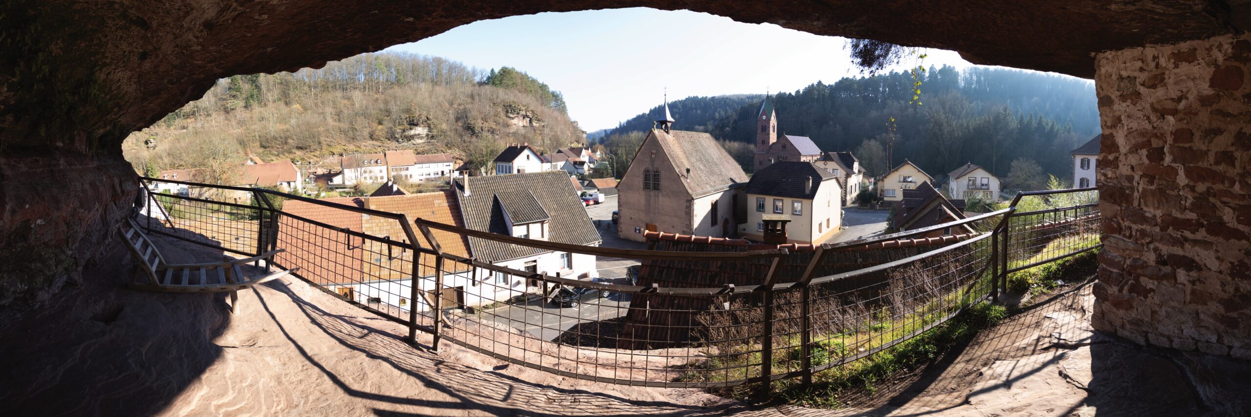 Après le panneau d’introduction (1), au bord de la Zinsel et de la forêt, engagez-vous sur le pont. Entre les premiers arbres, entrez dans les rêves des troglodytes… par une fenêtre des Maisons des Rochers (2). Suivez ensuite le chemin, qui rejoint une barre rocheuse (3). Tournez à gauche. Un peu plus sur votre droite, une série de photos de l’intérieur des Maisons des Rochers (4). Poursuivez et prenez le petit sentier sur votre droite. Gravissez quelques marches : un personnage (une sorcière ?) vous attend (5). Revenez sur vos pas, et rejoignez le village par le pont juste en face de vous. Contournez l’église catholique par sa droite, en marquant un arrêt devant la scène du bouquet (6). Rejoignez ensuite le presbytère catholique et son jardin de chapiteaux, où vous retrouverez notre sorcière (7). Soyez prudents pour admirer, de l’autre coté de la route, sur le mur de l’ancienne école, une photo panoramique (8). Traversez la route puis le parking à votre gauche. Devant les ruines de l’abbaye, une photo de la vue prise depuis les vestiges (9). Prenez la direction des Maisons des Rochers et ne manquez pas les photos devant la fontaine (10) et aux pieds des Maisons des Rochers (11). Il est temps de rejoindre les Maisons des Rochers (entrée payante) ! Sur le surplomb tout au bout du socle rocheux, la sorcière semble regagner le monde des esprits (12)… non sans avoir jeté un sort sur les Maisons troglodytiques : que fait cette fenêtre dans la fenêtre (13) ? Dans les Maisons, 4 photos des deux alsaciennes sont encadrées. Saurez-vous toutes les trouver ? Enfin, le Rêve des Troglodytes s’achève depuis le jardin des allumettes : levez les yeux en direction de la fabrique aux allumettes, pour un au revoir à nos trois personnages (15).